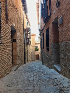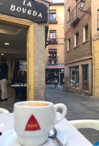 Toledo Sokakları: Zocodover Meydanı’ndan Katedral’e doğru yürürken geniş, iki taraflı hediyelik eşya dükkanlarının bulunduğu bir alışveriş sokağı var. Bu sokak ve diğer bir çok sokakta soldaki fotoğrafta olduğu gibi güneş ışınları ile parlayan Katedral’i görebilirsiniz. Alışveriş sokağından yürürken ara sokaklara girdiğinizde çok tatlı küçük sokaklar ve cafeler var. Dar ve tarihi sokaklarda yürüyüş ve burayı keşfetmek çok keyifliydi. Gezmekten yorulduysanız kahve molası vermenizi tavsiye ederim. Ben sevimli bir sokakta bulunan, küçük bir cafe “La Boveda” yı tercih ettim.